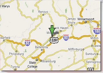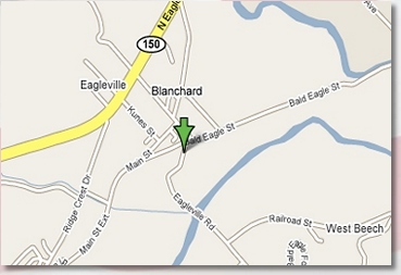 111 Eagleville Road Blanchard, PA 16826 Going East on Interstate 80 Coming East on 80-Exit 158-Take 150 North-will come to the town of Blanchard on your right, turn right on Beech Street, left on Liberty Street, to stop sign, go straight, at Y turn right, at the next Y turn left onto Eagleville Road, first place on left. Going West on Interstate 80 Coming West on 80-exit 178 to 220 North to Mill Hall-to 150 South through Beech Creek, cross iron bridge, first road to your left (Beech Street), then left on Liberty Street, to stop sign, go straight, at Y turn right, at the next Y turn left onto Eagleville Road, first place on left. |